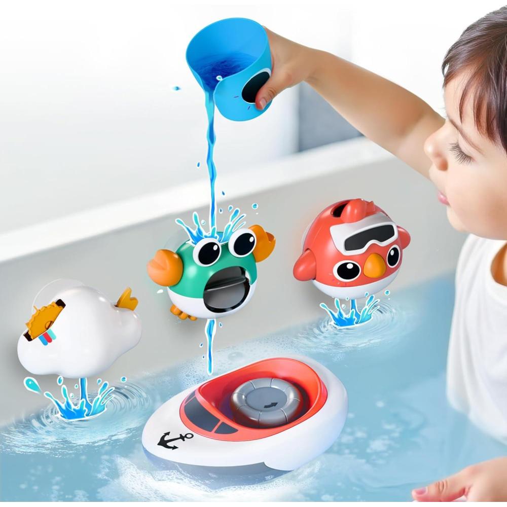 【Bath Time Fun】– By attaching suction cups, the bird, crab, and cloud can be attached to the bathtub to create a waterfall flow effect, enhancing water play fun. Alternatively, they can be mounted onto the boat for a wind-up sailing adventures. Different accessory combinations have different fun.