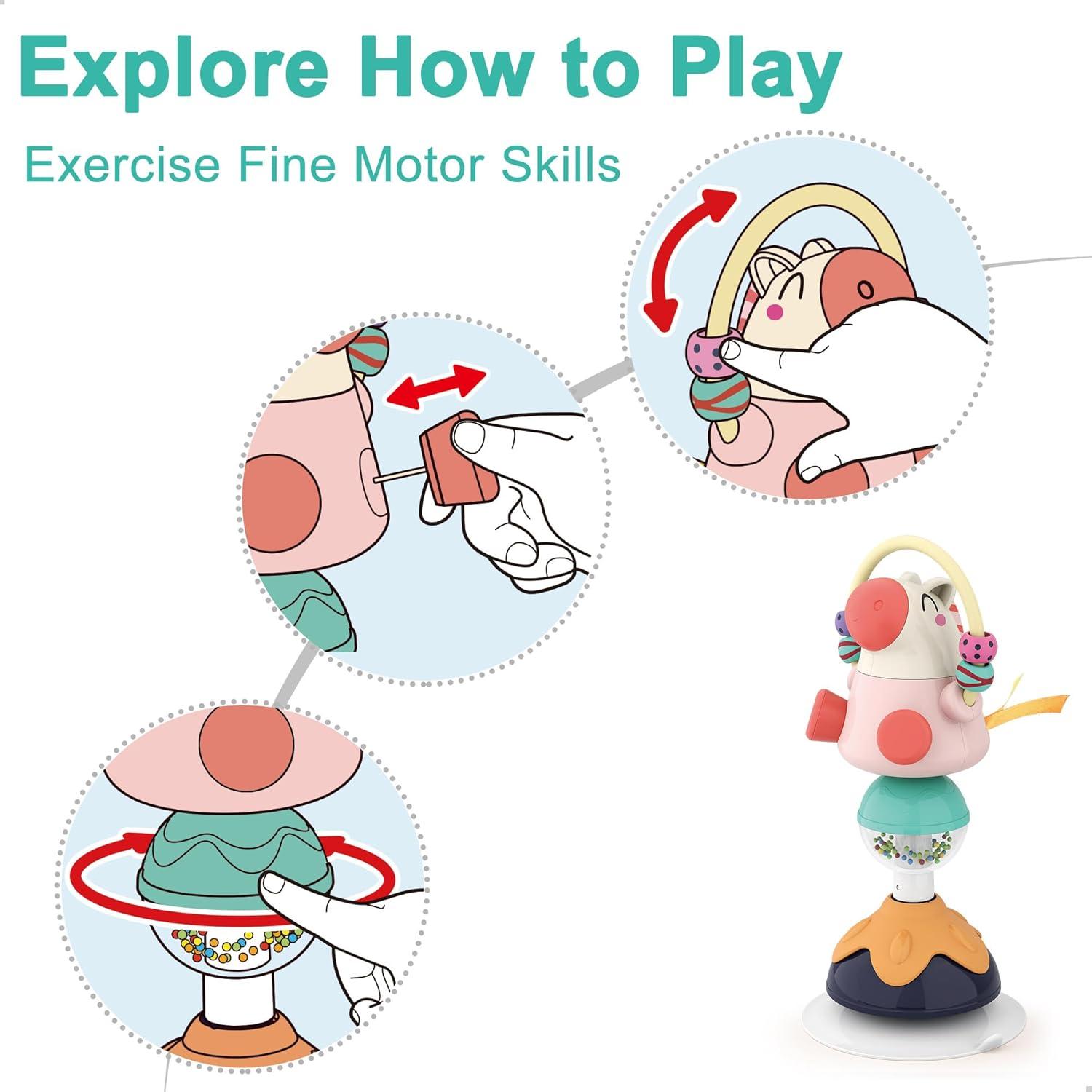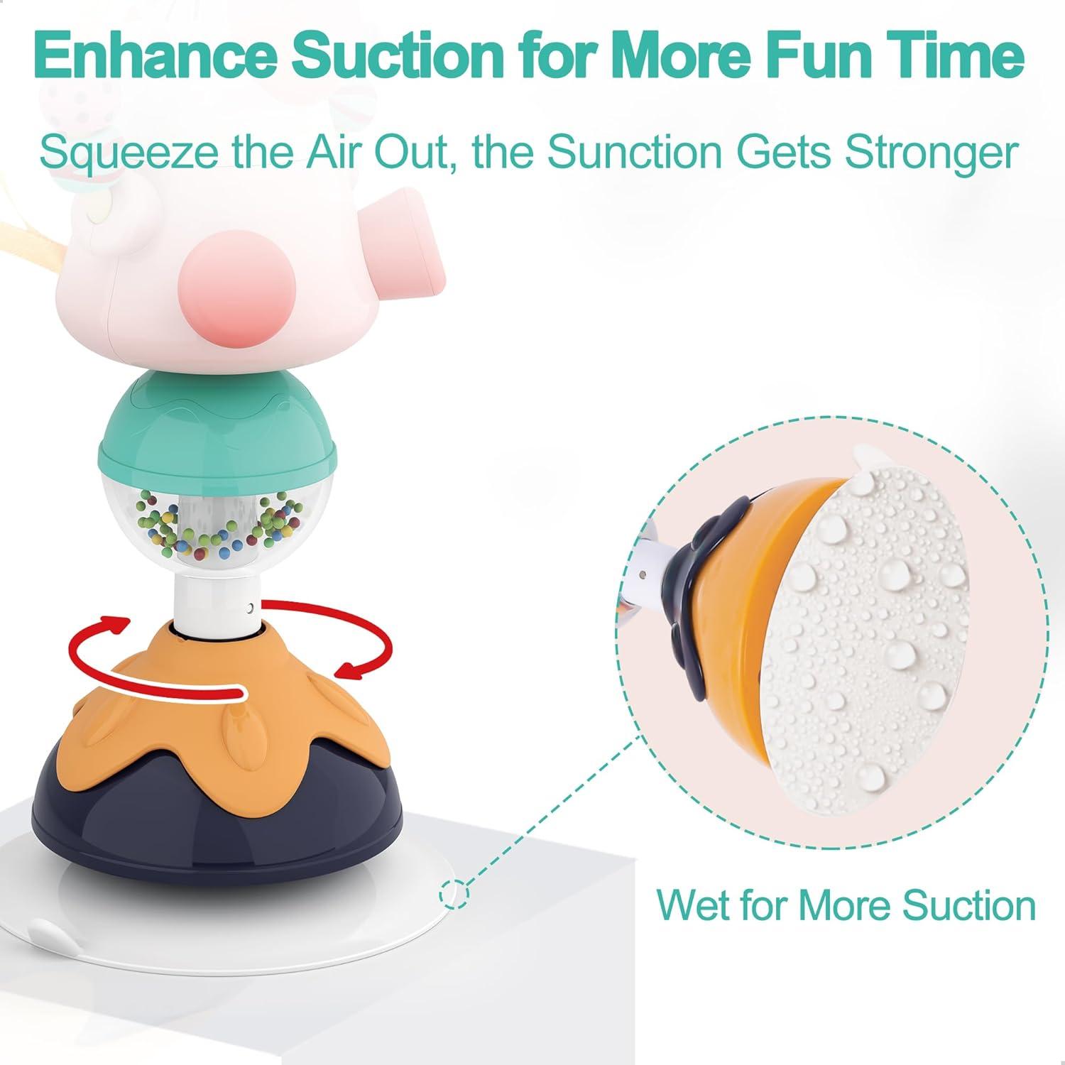 ♪Suction Design♪ Strong suction base easily attaches to the high chair, table, tray, floor or any smooth surfaces for frustration-free play. Wetting the suction cup will help this toy stick much better.