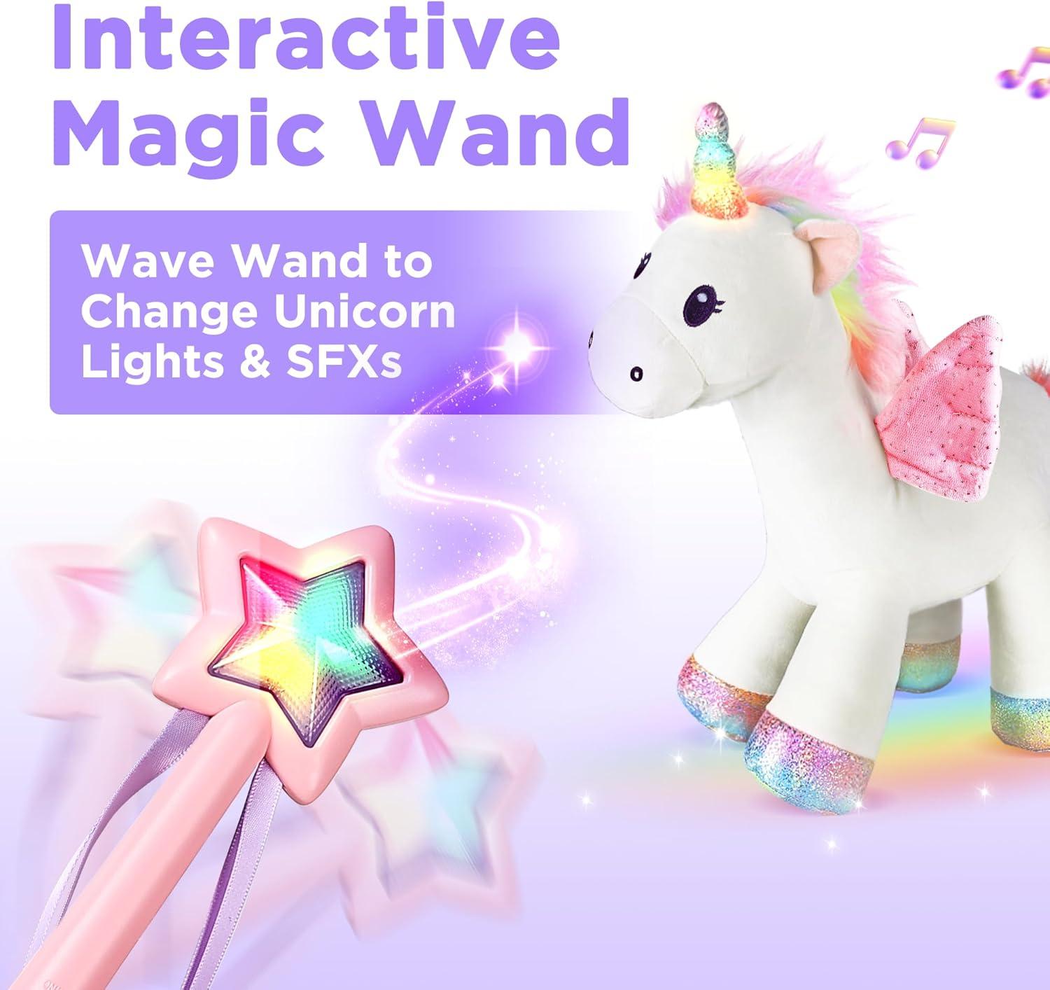 【Magical Response】Lights and sounds change with wand movements, immersing toddlers in a magical world. Automatic sleep mode after 3 minutes of inactivity (energy-saving). Pet the unicorn's mane to reawaken it, switching SFXs and music per touch.